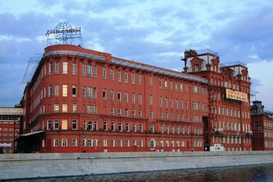 Keywords: building red brick rounded corners windows rows river embankment evening sky