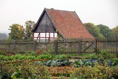 Keywords: building truss fachwerkhaus home garden fence idyll kohl vegetables autumn harvest country life rural
