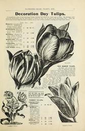 Keywords: Bulbs and plants (15768356053).jpg FLOWERING BULBS PLANTS ETC <br> 1 75 <br> Decoration Day Tulips <br> A magnificent class of late flowering Tulips coming into bloom the latter part of May By planting such <br> sorts as Gesneriana and the New Darwin a blaze of color can be kept up till Decoration Day They are <br> much more showy than the early varieties on account of their brilliant coloring and long flower stems <br> Each <br> Bizarres ” Ground color <br> yellow feathered or <br> striped crimson purple <br> or white choice mixed 3 <br> By bloemens Blotched <br> striped or feathered <br> blue liiac purple or <br> black 4 <br> Breeders ”i Mother Tu- <br> lips ” Large flowers of <br> solid colors scarlet <br> crimson violet etc 4 <br> Bouton d'Or ” The only <br> late pure yellow Tulip <br> Very fine 4 <br> Gesneriana ” Large <br> brilliant scarlet with <br> blue center 3 <br> Late Single ” Mixed 3 <br> ZARKE <br> V DARWIN TULIPS <br> lliant self-colored late <br> Tulips of immense size and <br> borne on strong stems many of them two <br> feet high The colors surpass in brilli- <br> ancy anything hitherto known in Tulips <br> and are of almost every conceivable color from <br> pale blush to the brightest red lilac light blue <br> and purple to almost <br> black etc Many of the <br> named sorts are sold at <br> enormous prices and the <br> mixture we offer contains <br> many very desirable <br> sorts Fine mixed col- <br> lors 4c ” --- ~~ ” <br> each 40c per doz <br> 2 75 per 100 <br> BYBLOE \\EN <br> SET OF TEN one Bulb <br> each named on this page <br> for 30 cts by mail <br> PARROT TULIPS <br> Admiral Con- <br> stantinople- <br> Red 4 <br> Cr a mo i sie ” <br> Brilliant ” A <br> great improve- <br> ment deepcrim- <br> son with large <br> black star- <br> shaped center <br> flowers and <br> bulbs larger <br> than other sorts 5 <br> Lutea ” Yellow 4 <br> Perfecta - Yel- <br> low and scarlet 4 <br> Finest Mixed- <br> All colors 3 <br> PARROT TULIP <br> DA WW IN TULIP 42214137 133055 65937 Page 7 Text http //www biodiversitylibrary org/page/42214137 1908 10 5962/bhl title 65937 Currie Brothers Company ; Henry G Gilbert Nursery and Seed Trade Catalog Collection Biodiversity Heritage Library Currie Bros Co Bulbs and plants autumn 1901 Garden Stories Bulbs Plants Catalogs Flowers Nurseries Horticulture Plants Ornamental Seeds U S Department of Agriculture National Agricultural Library bhl page 42214137 dc identifier http //biodiversitylibrary org/page/42214137 bhlGardenStories BHLinbloom bulbs plants nurseries horticulture plants ornamental u s department of agriculture national agricultural library bhlgardenstories bhlinbloom Information field Flickr posted date ISOdate 2015-01-28 Check categories 2015 August 24 CC-BY-2 0 BioDivLibrary https //flickr com/photos/61021753 N02/15768356053 2015-08-24 07 54 27 cc-by-2 0 PD-old-70-1923 Currie Bros catalogs Photos uploaded from Flickr by FĂŚ using a script