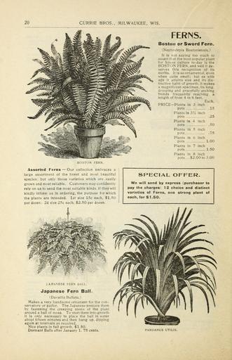 | Keywords: Bulbs and plants (15768378903).jpg 20 <br> CURRlE BROS MILWAUKEE WIS <br> FERNS <br> Boston or Sword Fern <br> Nephrolepis Bostoniensis <br> It is not saying too much to <br> assert that the most popular plant <br> for house culture to-dav is the <br> BOSTON FERN and well it de- <br> serves this recognition of its <br> merits It is so ornamental even <br> when quite small but as with <br> age it attains size and its dis- <br> tinctive habit of growth it makes <br> a magnificent specimen its long <br> drooping and gracefully arching <br> fronds frequently reaching a <br> length of from 4 to 6 feet <br> Each <br> PRICE-Plants in 3 inch <br> pots 15 <br> Plants in 3 2 inch <br> pots 25 <br> Plants in 4 inch <br> pots 50 <br> Plants in 5 inch <br> pots 75 <br> Plants in 6 inch <br> pots 1 00 <br> Plants in 7 inch <br> pots 1 50 <br> Plants in 8 inch <br> pots 2 00 to 3 00 <br> BOSTON FERN <br> Assorted Ferns ” Our collection embraces a <br> large assortment of the finest and most beautiful <br> species; but only those varieties which are easily <br> grown and most reliable Customers may confidently <br> rely on us to send the most suitable kinds if they will <br> kindly inform us in ordering the purpose for which <br> the plants are intended 1st size 15c each 1 50 <br> per dozen 2d size 25c each 2 50 per dozen <br> SPECIAL OFFER <br> We will send by express purchaser to <br> pay the charges 1 2 choice and distinct <br> varieties of Ferns one strong plant of <br> each for SI 50 <br> E n <br> J APANESE FERN BALL <br> Japanese Fern Ball <br> DavalliaBullata <br> Makes a very handsome ornament for the con- <br> servatory or parlor The Japanese prepare them <br> by fastening the creeping stems of the plant <br> around a ball of moss To start them into growth <br> it is only necessary to place the ball in water <br> about fifteen minutes and then hang up dipping <br> again at intervals as required <br> Nice plants in full growth 1 50 <br> Dormant Balls after Januarv 1 75 cents <br> PANDANL'S LTILIS 42214150 133055 65937 Page 20 Text http //www biodiversitylibrary org/page/42214150 1908 10 5962/bhl title 65937 Currie Brothers Company ; Henry G Gilbert Nursery and Seed Trade Catalog Collection NameFound Nephrolepis NameConfirmed Nephrolepis EOLID 61678 NameBankID 2644730 Biodiversity Heritage Library Currie Bros Co Bulbs and plants autumn 1901 Garden Stories Bulbs Plants Catalogs Flowers Nurseries Horticulture Plants Ornamental Seeds U S Department of Agriculture National Agricultural Library bhl page 42214150 dc identifier http //biodiversitylibrary org/page/42214150 bhlGardenStories BHLinbloom bulbs plants nurseries horticulture plants ornamental u s department of agriculture national agricultural library bhlgardenstories bhlinbloom Information field Flickr posted date ISOdate 2015-01-28 Check categories 2015 August 24 CC-BY-2 0 BioDivLibrary https //flickr com/photos/61021753 N02/15768378903 2015-08-24 07 56 01 cc-by-2 0 PD-old-70-1923 Currie Bros catalogs Photos uploaded from Flickr by Fæ using a script |