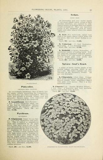 | Keywords: Bulbs and plants (16200762038).jpg FLOWERING BULBS PLANTS ETC <br> 27 <br> PLATYCODOX <br> Platycodon <br> CHINESE BELI FLOWER <br> An exceedingly handsome class of hardy bor- <br> der plants closely resembling the Campanulas <br> with which thev are often confounded They are <br> bushy and upright in growth foliage neat and <br> attractive ; flowers large very numerous and <br> showy ; succeed well in any good soil <br> P Grandiflorum Bell Flowers <br> 3 feet A very handsome plant one <br> of the best in cultivation ; blooms <br> continuously all summer Flowers <br> blue bell-shaped Each 15c; per <br> doz 1 50 <br> Pyrethrum <br> FEVERFEW <br> P Uliginosum Giant Ox-eye Dai- <br> sy 4 to 5 feet September and Octo- <br> ber This is indeed a magnificent <br> plant and considered by all plant <br> lovers who have seen it one of the <br> very finest for the herbaceous border <br> and pre-eminently the best of its color <br> for supplying cut flowers in the au- <br> tumn It forms a stout upright bush <br> Avith light green leaves bearing in- <br> numerable large pure white flowers <br> having bright yellow centers The <br> individual flowers measure from 2 to 3 <br> inches across and are borne in large <br> flat cymes each flower having a stiff <br> wiry stem admirably adapting it for <br> cutting purposes <br> Each 20c per doz 2 00 <br> Sedum <br> SOKE CROP <br> An interesting ami very useful family <br> of succulent plants which owing to their <br> peculiar structure are enabled to with- <br> stand a degree of drought that most plants <br> would succumb to They are therefore <br> useful in dry situations such as sunny <br> banks and other places where few plants <br> will grow <br> S Acre For rock-work carpet bed- <br> 'linu' or for shady places where grass will <br> not mow this very dwarf Sedum is ex- <br> cellent <br> Each 10c per do/ 1 00 <br> S Fabarium l- foot September <br> Rosy pink A very desirable plant <br> Each 15c; per doz 1 50 <br> S Sieboldii 6 inches September A <br> handsome variety of trailing habit Foli- <br> age glaucous margined with pink assum- <br> ing shades of red and purple in autumn ; <br> flowers bright pink very pretty and <br> showv A splendid rock plant <br> Each 20c ; per do/ 2 00 <br> Spiraea Goat's Beard <br> A genus of hardy border plants of the <br> easiest culture growing freely in any <br> good soil The taller varieties are very <br> effective in the shrubbery border All <br> are very desirable <br> S Filipendula 3 feet June Foliage <br> dark green beautifully cut and Fern-like <br> flowers double white sometimes tinged <br> with pink ; very showy This is a very <br> handsome plant <br> S Ulmaria fl pi Double Meadow Sweet <br> 3 feet June A beautiful and very desirable <br> variety with double white flowers <br> Each 20c ; per do/ S2 00 <br> rVRETHKVM UlilGINOSTJM GIANT OX-EYE DAIS1 42214157 133055 65937 Page 27 Text http //www biodiversitylibrary org/page/42214157 1908 10 5962/bhl title 65937 Currie Brothers Company ; Henry G Gilbert Nursery and Seed Trade Catalog Collection NameFound Fabarium NameFound Filipendula NameConfirmed Filipendula EOLID 29967 NameBankID 2650266 NameFound Grandiflorum NameFound Platycodon NameConfirmed Platycodon A DC EOLID 70892 NameFound Pyrethrum NameConfirmed Pyrethrum Medik EOLID 2879753 NameBankID 8777274 NameFound Sedum NameConfirmed Sedum EOLID 11172101 NameBankID 2649473 NameFound Spiraea NameConfirmed Spiraea EOLID 29951 NameBankID 2650385 NameFound Uliginosum NameFound Ulmaria NameConfirmed Ulmaria EOLID 5588261 NameBankID 4906306 NameFound Ulmaria fl Biodiversity Heritage Library Currie Bros Co Bulbs and plants autumn 1901 Garden Stories Bulbs Plants Catalogs Flowers Nurseries Horticulture Plants Ornamental Seeds U S Department of Agriculture National Agricultural Library bhl page 42214157 dc identifier http //biodiversitylibrary org/page/42214157 bhlGardenStories BHLinbloom bulbs plants nurseries horticulture plants ornamental u s department of agriculture national agricultural library bhlgardenstories bhlinbloom Information field Flickr posted date ISOdate 2015-01-28 Check categories 2015 August 24 CC-BY-2 0 BioDivLibrary https //flickr com/photos/61021753 N02/16200762038 2015-08-24 07 52 07 cc-by-2 0 PD-old-70-1923 Currie Bros catalogs Photos uploaded from Flickr by FĂŚ using a script |