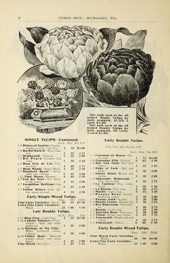 Keywords: Bulbs and plants (16200955870).jpg CURRIE BROS MILWAUKEE WIS <br> One bulb each of the 40 <br> named Single Tulips by <br> mail postpaid SI 25; 3 <br> each S3 50 <br> One bulb each of the 18 <br> named Double Tulips by <br> mail postpaid 60 cents; <br> 3 each 1 50 <br> <br> SINGLE TULIPS ” Continued <br> Each Doz Per 100 <br> b 9 Prince of Austria-Orange <br> shaded scarlet very fine 5 45 3 00 <br> b 6 Rachel Ruisch ” Rosy pink <br> fine 4 35 2 25 <br> a 7 Rembrandt ” Crimson 4 35 2 00 <br> c 7 R oi P e p i n ” Crimson and <br> white 7 70 5 50 <br> c 6 Rose Gris de Lin ” Very <br> finerose 4 40 2 75 <br> c 7 Rosa Mundi ” Bright Rose 4 35 2 50 <br> d 7 Standard Royal ” Silver <br> white and crimson 5 45 3 00 <br> c 12 Thos Moore ” Orange 4 40 2 50 <br> b7Van der Neer ” The finest <br> of all violets 4 35 2 00 <br> b 7 Vermillion Brilliant-Fine <br> red 5 45 3 50 <br> c 7 Yellow Prince ” Fine yel- <br> low sweet scented 4 35 2 50 <br> Early Single Mixed Tulips <br> Doz 100 1000 <br> Fine Early Varieties ” Mixed 20 85 7 50 <br> Extra Fine Early Varieties ” <br> Mixed 25 100 8 50 <br> Late Double Tulips <br> Each Doz 100 <br> e 17 Blue Flag ” Violet blue 4 35 2 00 <br> f 12 Labelle Alliance- Over <br> winner' ” Blue and white <br> feathered 4 35 2 00 <br> g 16 Manage de Ma Fill e ” <br> White feathered cherrv <br> crimson 5 50 4 00 <br> g 10 Yellow Rose - Splendid <br> golden vellow verv large <br> flower 4 35 2 00 <br> Fine Mixed ” All colors 3 25 1 25 <br> Early Double Tulips <br> If by mail add 40c per 100 <br> Each <br> -Fin- <br> Doz Per 100 <br> Orange <br> -Red and <br> c 9 Couronne de Roses- <br> est rose <br> MO Couronne d'Or- <br> b 6 Due Van Tholl <br> vellow 3 <br> c Duke of York ” Red and <br> white 3 <br> c 9 Gloria Solus ” Brown and <br> vellow 3 <br> b S Imperator Rubrorum ” <br> Very fine scarlet 4 <br> c 8 La Candeur ” Pure white <br> finest 3 <br> c 6 La Blazon ” Fine rose 4 <br> c n Murilo ” Light rose 5 <br> e'Β»Paeony R o s e ” Scarlet <br> feathered vellow 3 <br> e 9 Paeony Gold ” Scarlet 3 <br> b 9 Purple Crown ” Bronze red 3 <br> c 8 Rex Rubrorum ” Fine scar- <br> let 4 <br> c 8 Rosine ” Light rose 4 <br> b 7 Salvator Rose ” Fine rose 5 <br> d 8 Titian ” Brown and yellow 3 <br> e 9 Tournesoll ” Bright red and <br> vellow 4 <br> b 8 Tournesoll ”Yellow 6 <br> 75 <br> 65 <br> 30 <br> 30 <br> 40 <br> 5 00 <br> 4 50 <br> 1 25 <br> 200 <br> 200 <br> 2 75 <br> 30 1 50 <br> 40 2 75 <br> 45 3 50 <br> 30 <br> 30 <br> 30 <br> 40 <br> 40 <br> 50 <br> 25 <br> 40 <br> 60 <br> 200 <br> 200 <br> 2 25 <br> 2 75 <br> 2 50 <br> 400 <br> 1 75 <br> 2 75 <br> 4 50 <br> Early Double Mixed Tulips <br> Doz 100 1000 <br> Fine Mixed Early Varieties <br> Mixed <br> Extra Fine Early Varieties- <br> Mixed 25 1 00 <br> 20 90 8 00 <br> 900 42214136 133055 65937 Page 6 Text http //www biodiversitylibrary org/page/42214136 1908 10 5962/bhl title 65937 Currie Brothers Company ; Henry G Gilbert Nursery and Seed Trade Catalog Collection NameFound Rubrorum NameFound Salvator NameConfirmed Salvator NameBankID 212455 NameFound Solus NameConfirmed Solus EOLID 13932317 NameBankID 2991169 Biodiversity Heritage Library Currie Bros Co Bulbs and plants autumn 1901 Garden Stories Bulbs Plants Catalogs Flowers Nurseries Horticulture Plants Ornamental Seeds U S Department of Agriculture National Agricultural Library bhl page 42214136 dc identifier http //biodiversitylibrary org/page/42214136 bhlGardenStories BHLinbloom bulbs plants nurseries horticulture plants ornamental u s department of agriculture national agricultural library bhlgardenstories bhlinbloom Information field Flickr posted date ISOdate 2015-01-28 Check categories 2015 August 24 CC-BY-2 0 BioDivLibrary https //flickr com/photos/61021753 N02/16200955870 2015-08-24 07 54 41 cc-by-2 0 PD-old-70-1923 Currie Bros catalogs Photos uploaded from Flickr by FΓ¦ using a script