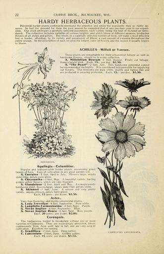 | Keywords: Bulbs and plants (16200984670).jpg of each we give the height color of flowers and the season it usually begins <br> to bloom <br> ACHILLEA Milfoil or Yarrow <br> These plants are remarkable for their ornamental foliage as well as <br> handsome flowers; should be in every collection <br> A Millefolium Roseum 1 foot August Finely cut foliage; <br> flowers bright pink Each 15c; per doz 1 50 <br> A The Pearl 2 feet July This handsome perennial cannot <br> be recommended too highlv It is considered indispensable for supplying <br> cut flowers The blossoms are pure white double and button-like and <br> are produced in amazing profusion Each 15c; per doz 1 50 <br> AQUILEGIA <br> Aquilegia Columbine <br> Popular and indispensable border plants possessing great <br> beauty of form Easy of cultivation in any good garden soil <br> A Coerulea 1 foot April to July Flowers large sepals <br> violet blue petals pure white <br> A Chrysantha 3 feet May A beautiful variety having <br> golden yellow flowers which are very fragrant <br> A Glandulosa 1 foot April and May A conspicuously <br> handsome plant flowers large sepals deep blue petals white <br> A Skinneri 3 feet June A unique and very pretty <br> variety sepals crimson petals light green <br> Each 15 cents; per dozen 1 50 <br> Aster <br> Very free flowering and highly ornamental plants <br> A Lady Trevellyn 4 feet September Pure white <br> A Longifolio Formosissima 3 feet Sept Purple <br> A Novae Angliae 6 feet September Blue <br> A Novae Angliae Rosea 6 feet Sept Rosy purple <br> Each 20 cents; per dozen 2 00 <br> Coreopsis <br> The herbaceous border is incomplete without one or more <br> varieties of Coreopsis They are exceedingly attractive bloom <br> continuously from June until late in fall and are very easy of <br> cultivation Excellent for cutting <br> C Gradiflora 2 feet June Deep yellow <br> C Lanceolata 2 feet June Golden yellow <br> Each 15 cents; per dozen 1 50 <br> COHHOKSIS LANCHOLATA 42214152 133055 65937 Page 22 Text http //www biodiversitylibrary org/page/42214152 1908 10 5962/bhl title 65937 Currie Brothers Company ; Henry G Gilbert Nursery and Seed Trade Catalog Collection NameFound ACHILLEA NameConfirmed Achillea EOLID 36945 NameBankID 2657276 NameFound Aquilegia NameConfirmed Aquilegia EOLID 11205314 NameBankID 2645540 NameFound Coreopsis NameConfirmed Coreopsis L EOLID 38349 NameFound Formosissima NameFound Glandulosa NameConfirmed Glandulosa EOLID 63989 NameBankID 4549918 NameFound Lanceolata NameConfirmed LANCEOLATA EOLID 2762079 NameBankID 544027 NameFound Millefolium NameConfirmed Millefolium NameBankID 4906240 Biodiversity Heritage Library Currie Bros Co Bulbs and plants autumn 1901 Garden Stories Bulbs Plants Catalogs Flowers Nurseries Horticulture Plants Ornamental Seeds U S Department of Agriculture National Agricultural Library bhl page 42214152 dc identifier http //biodiversitylibrary org/page/42214152 bhlGardenStories BHLinbloom bulbs plants nurseries horticulture plants ornamental u s department of agriculture national agricultural library bhlgardenstories bhlinbloom Information field Flickr posted date ISOdate 2015-01-28 Check categories 2015 August 24 CC-BY-2 0 BioDivLibrary https //flickr com/photos/61021753 N02/16200984670 2015-08-24 07 55 49 cc-by-2 0 PD-old-70-1923 Currie Bros catalogs Photos uploaded from Flickr by FĂŚ using a script |