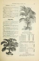 | Keywords: Bulbs and plants (16362407776).jpg s of which we <br> cheerfully furnish on application We here enum- <br> erate a few of the most popular <br> Areca Lutescens Slender plume-like leaves a <br> very handsome excellent house plant Price each <br> 50c <br> Cocos Weddeliana-A charming plant unquest- <br> ionably the most graceful of all the small Palms; ex- <br> tensively used as table ornaments Price each 25c <br> to 50c <br> Kentia Belmoreana Resembles Areca but is <br> hardier and more robust in habit of growth; the <br> leaves are strong yet very graceful and are a rich <br> dark green; a splendid house plant and in great de- <br> mand Price each small plants 25c <br> Kentia Fosteriana A beautiful species with <br> bright green foliage; broader and heavier than that <br> of the foregoing Price each small plants 25c <br> CHINESE FAN PALM <br> KENTIA BELMOREANA <br> Prices of larger Kentias <br> Height Belmoreana Fosteriana <br> 10 inches each 50 35 <br> 12 inches each 75 50 <br> 12 to 15 inches each 1 00 75 <br> 15 to 18 inches each 1 25 1 00 <br> 18 to 20 inches each 1 50 1 25 <br> 20 to 22 inches each 2 00 150 <br> 22 to 24 inches each 2 50 2 00 <br> 24 to 28 inches each 3 00 2 50 <br> 28 to 32 inches each 4 00 3 00 <br> 32 to 36 inches each 5 00 3 50 <br> Latania Borbonica Chinese Fan Palm A <br> great favorite perhaps the most desirable of all the <br> Palms for general cultivation Leaves broadly fan - <br> shaped <br> Small plants Price each 25 <br> 12 inches high Price each 50 <br> 15 inches high Price each 1 00 <br> 18 inches high Price each 1 50 <br> 30 inches high Price each 5 00 <br> Phoenix Reclinafa An excellent Palm; stands <br> much abuse therefore very useful for decoration <br> 10 inches high Price each 50 <br> 12 inches high Price each 75 <br> 15 inches high Price each 1 00 <br> 18 inches high Price each 1 50 <br> 20 inches high Price each 2 00 <br> Smilax <br> Myrsiphyllum Aspai agoiJes <br> This charming vine is now considered quite indis- <br> pensable in all tloral decorations It is verv easil\ <br> grown Price leach 15c 42214151 133055 65937 Page 21 Text http //www biodiversitylibrary org/page/42214151 1908 10 5962/bhl title 65937 Currie Brothers Company ; Henry G Gilbert Nursery and Seed Trade Catalog Collection NameFound Areca NameConfirmed Areca EOLID 29328 NameBankID 2665610 NameFound Kentia belmoreana NameConfirmed Kentia belmoreana C Moore F Muell EOLID 1142854 NameBankID 8371204 NameFound Latania NameConfirmed Latania EOLID 35120 NameBankID 1850318 NameFound Myrsiphyllum NameConfirmed Myrsiphyllum EOLID 5890390 NameBankID 3411724 NameFound Pandanus NameConfirmed Pandanus subsect Retusiflora Huynh EOLID 31710 NameFound Smilax NameConfirmed Smilax Jorge08 EOLID 3396175 Biodiversity Heritage Library Currie Bros Co Bulbs and plants autumn 1901 Garden Stories Bulbs Plants Catalogs Flowers Nurseries Horticulture Plants Ornamental Seeds U S Department of Agriculture National Agricultural Library bhl page 42214151 dc identifier http //biodiversitylibrary org/page/42214151 bhlGardenStories BHLinbloom bulbs plants nurseries horticulture plants ornamental u s department of agriculture national agricultural library bhlgardenstories bhlinbloom Information field Flickr posted date ISOdate 2015-01-28 Check categories 2015 August 24 CC-BY-2 0 BioDivLibrary https //flickr com/photos/61021753 N02/16362407776 2015-08-24 07 55 11 cc-by-2 0 PD-old-70-1923 Currie Bros catalogs Photos uploaded from Flickr by FĂŚ using a script |