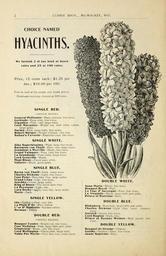 | Keywords: Bulbs and plants (16386614981).jpg CURRIE BROS MILWAUKEE WIS <br> CHOICE NAMED <br> HYACINTHS <br> We furnish 3 of one kind at dozen <br> rates and 25 at 100 rates <br> Price 12 cents each; 1 25 per <br> doz ; 10 00 per 100 <br> Free by mail at the single and dozen prices <br> Purchaser must pay charges at 100 rates <br> SINGLE RED <br> VARIOUS SHADES <br> General Pellissier Deep crimson fine truss <br> Gertrude Deep pink tine truss <br> Gigantea Pink very large truss <br> Lord Macaulay Bright red with white center <br> large spike <br> Norma Pink large bells fine spike <br> Robert Steiger Bright crimson very fine <br> Sultan's Favorite Beautiful rose fine truss <br> SINGLE WHITE <br> Alba Superbissima Pure large fine truss <br> Baroness von Thuill Pure very large truss <br> Grandeur a Merville Blush fine truss <br> Grand Vainquer Pure very fine truss <br> La Grandesse Pure white large truss <br> Lord Granville Blush <br> Mont Blanc Finest pure white <br> Voltaire Blush good spike <br> SINGLE BLUE <br> Baron von Thuill Dark large truss <br> Charles Dickens Light fine truss <br> Czar Peter Porcelain blue large spike <br> Grand Lilas Lilac fine truss <br> Jeschko Violet large spike <br> King of Blues The finest dark blue <br> La Peyrouse Light low <br> Lord Derby Ught very fine large spike <br> Marie Dark <br> SINGLE YELLOW <br> Ida Golden yellow very fine <br> La Pluie d' Or Rich Yellow <br> L' or D Australie Golden yellow <br> Merman Yellow <br> DOUBLE RED <br> VARIOUS SHADES <br> Bouquet Tendre Bright red fine truss <br> Czar Nicholas Pink large bells and spike <br> Grootvorst Blush very fine truss <br> Lord Wellington Finest pink large bells <br> Noble Par Merite Very fine rose large truss <br> DOUBLE WHITE <br> Anna Maria Blush fine truss <br> Bouquet Royal Pure <br> La Tour d' Auvergne Pure fine truss <br> La Virginite Blush large bells and spike <br> Prince of Waterloo Pure <br> DOUBLE BLUE <br> Bloksberg Porcelain large bells and spike <br> Charles Dickens Light blue large compact <br> truss <br> Garrick Azure fine truss <br> Lord Raglan Dark tine <br> Prince of Saxony Weimar Rich purple tine <br> truss <br> DOUBLE YELLOW <br> Bouquet de Orange Orange <br> Goethe Sulphur yellow tine truss <br> Jaune Supreme Pure 42214132 133055 65937 Page 2 Text http //www biodiversitylibrary org/page/42214132 1908 10 5962/bhl title 65937 Currie Brothers Company ; Henry G Gilbert Nursery and Seed Trade Catalog Collection NameFound Gigantea NameConfirmed Gigantea EOLID 91906 NameBankID 4549793 NameFound Lilac NameConfirmed Lilac P Miller 1754 NameFound Superbissima Biodiversity Heritage Library Currie Bros Co Bulbs and plants autumn 1901 Garden Stories Bulbs Plants Catalogs Flowers Nurseries Horticulture Plants Ornamental Seeds U S Department of Agriculture National Agricultural Library bhl page 42214132 dc identifier http //biodiversitylibrary org/page/42214132 bhlGardenStories BHLinbloom bulbs plants nurseries horticulture plants ornamental u s department of agriculture national agricultural library bhlgardenstories bhlinbloom Information field Flickr posted date ISOdate 2015-01-28 Check categories 2015 August 24 CC-BY-2 0 BioDivLibrary https //flickr com/photos/61021753 N02/16386614981 2015-08-24 07 55 46 cc-by-2 0 PD-old-70-1923 Currie Bros catalogs Photos uploaded from Flickr by FĂŚ using a script |