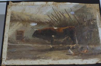 | Keywords: Bull Standing with Chickens, by Frank Reaugh, undated, oil on canvas - Harry Ransom Center - University of Texas at Austin - DSC08473.jpg en Painting by Frank Reaugh 1860-1945 exhibited in the Harry Ransom Center University of Texas at Austin Austin Texas USA This artwork is in the public domain because the artist died more than 70 years ago 2015-11-17 16 48 31 own Daderot other versions PD-old-70 cc-zero Paintings by Frank Reaugh in the Harry Ransom Center | ||||