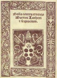 | Keywords: Bulla-contra-errores.jpg Papst Leo X žBulla contra errores Martini Lutheri et sequacium Deutsch žBulle gegen die Irrtümer Luthers und seiner Anhänger Rom Jacobus Mazochius 1520 Am 15 Juni 1520 erschien in Rom die Bannandrohungsbulle gegen Luther die dem Ketzer sechzig Tage Zeit zum Widerruf ließ Andernfalls erfolgten die endgültige Bannung und die Auslieferung an die weltliche Gewalt Weiterhin forderte die Bulle die Verbrennung der Schriften Luthers In gedruckter Form wurde das Dokument von Johann Eck und seinen Helfern in Deutschland verbreitet allerdings fand sich dafür in Kursachsen niemand Offensichtlich fühlte sich Luther seiner Sache so sicher dass er seinen Freund Georg Spalatin veranlasste die Bulle in deutscher à bersetzung in Leipzig drucken zu lassen Nachdem in Köln Luthers Bücher öffentlich verbrannt worden waren fühlte sich dieser zu einem weiteren Schritt des Widerstandes ermutigt Am 10 Dezember 1520 verbrannte er vor dem Elstertor unter großem Zulauf von Studenten Werke des Kirchenrechtes und Schriften seiner Gegner Als letztes Stück übergab er auch ein Exemplar der Bannandrohungsbulle den Flammen Luther war also überzeugt dass er mit gleichem ja besserem Recht den Papst aus der Kirche ausschließen könne als jener es mit ihm getan hatte Die öffentliche Begründung dafür nahm Luther in der Schrift ž Warum des Papstes und seiner Jünger Bücher von Dr M Luther verbrannt sind vor Luther erblickte nämlich im Papst den in der Bibel geweissagten Antichrist der am Ende aller Tage in der Kirche die Macht an sich reißen und die wahren Gläubigen verfolgen sollte PD-old Martin Luther 1520 documents 1520 in art Leo X Religious books book covers single pages etc Papal bulls Augmented coat of arms of the House of Medici Leo X Papal coats of arms Leo X 1520 in Christianity |