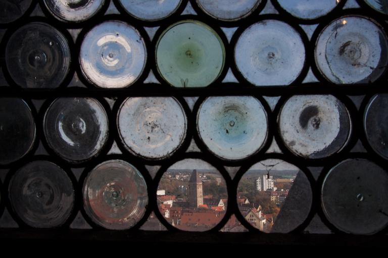 Keywords: bullseye leaded glass navel slices slug glass round glass greenish lead version münster ulm cathedral building church ulm city architecture by looking outlook goose tower