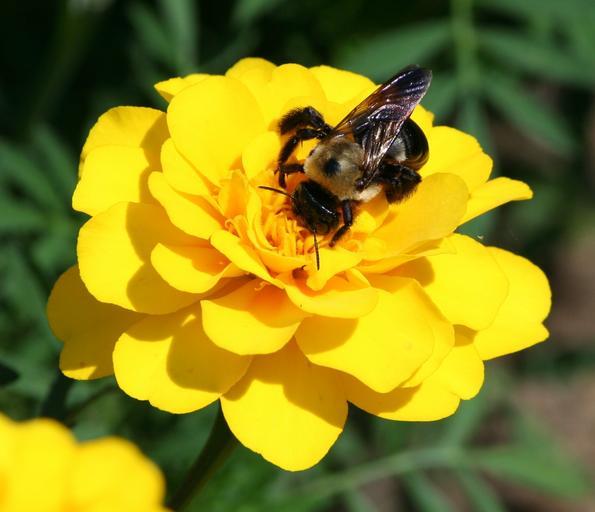 Keywords: bumble bee sting insect fly sitting sucking flower yellow marigold