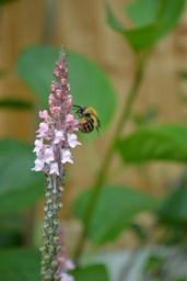 Keywords: bumblebee drinking nectar pale-pink loosestrife cottage garden insect flower summer bombus pascuorum worker close-up