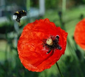 Keywords: bumblebee poppies flight pollen the collection of work flowers macro diligence pollination insect garden closeup pollination of flowers flowering poland village