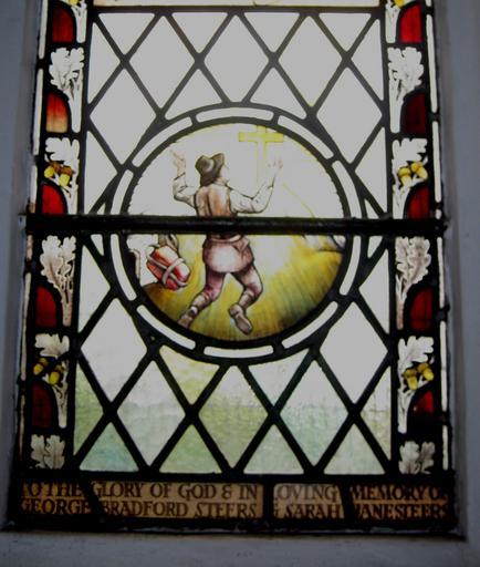 | Keywords: Bunyan Roundel.JPG en Roundel from one of Arnold Robinson's windows in the Kingsdown area of Bristol Robinson designed and installed four three-light windows this a short while after the 1927 restoration and in the central light of these windows he depicts in turn John Bunyan William Tindale Archbishop Cranmer and Charles Wesley The right and left hand lights of the four windows are either plain or hold some coloured glass The window dedicated to Bunyan has John Bunyan in the centre light with a copy of Pilgrim ™s Progress tucked under his arm The window is inscribed To the Glory of God in loving memory of George Bradford Steers Sarah Jane Steers Below Bunyan Robinson painted a roundel with a scene from the Pilgrim ™s Progress The three-light window featuring William Tindale has Tindale carrying a copy of his famous Bible and in a roundel beneath he is depicted writing that Bible The window is inscribed In Loving Memory of Richard Dalton Another three-light window depicts Charles Wesley who had lived in nearby St James ™s which through growth and popularity led to the need for a new church in the adjacent new suburb of Kingsdown that new Church being St Matthews and in the roundel beneath he is shown writing at his desk The inscription reads In Loving Memory of Albert E Hill Another three-light window depicts Archbishop Cranmer and in a roundel below we see Cranmer about to be burnt at the stake The inscription reads In loving memory of Catharine Hill The Hills and Dalton were long-serving Churchwardens of St Matthew ™s 2012-05-08 own Weglinde cc-zero Uploaded with UploadWizard Stained glass windows in Bristol John Bunyan |