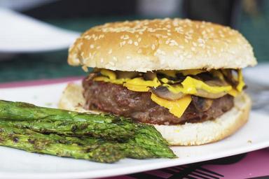 Keywords: burger grill grilled hamburger meal barbeque meat bbq grilling barbecue asparagus