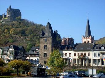 | Keywords: BurgStahleckBacharach.jpg en View over Bacharach from the rhinepark Shown are Stahleck castle on the left the market gate in the middle followed by the ruin of the Wernerchapel destroyed by debris in 1689 when the castle was blown up At the right the tower of St Peter is to be seen In the very front of the town the railroad line between Mainz and Koblenz is to be recognized de Panoramablick von den Rheinwiesen aus auf den Ort Bacharach Wichtige Gebäude von links nach rechts Burg Stahleck Markttor Ruine der Wernerkapelle und der Turm von St Peter Vor dem Ort direkt an der Stadtmauer ist die linksrheinische Bahnstrecke leicht zu erkennen own Carol Christiansen 2008-10-20 50 06028 7 76993 type landmark_region DE-R Bacharach Burg Stahleck |