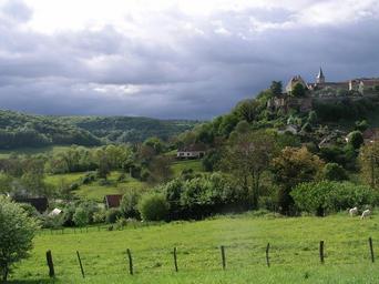 Keywords: burgundy village church hill france cows pasture clouds nature valley landscape sky