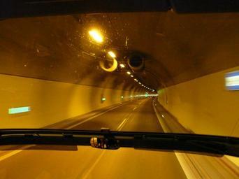 Keywords: bus bus ride exit travel road drive the front cover is tunnel dark yellow traffic free ride