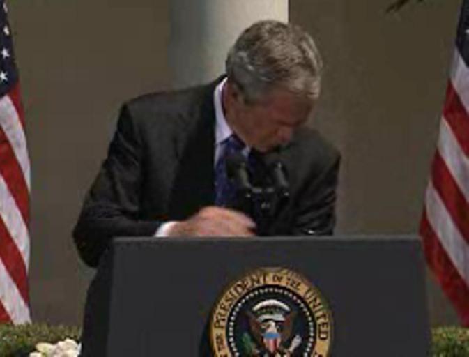 | Keywords: Bush Bird Poop crop.png Crop of Image Bush Bird Poop 2 png Image Screen shot Image 2 of 4 of United States President George W Bush wipes off bird feces with his bare hand during a press conference on May 24 2007 in the White House Rose Garden Bush was addressing the American press in the White House's Rose Garden The incident occurred just as Bush said I've got confidence in Al Gonzales doin' the job referring to a question asked by a reporter about the controversial dismissal of several U S attorneys Source http //www whitehouse gov/news/releases/2007/05/20070524 html <br /> Direct link to video http //mfile akamai com/5913/wmv/whitehouse download akamai com/5913/2007/05/20070524 v asx obj 2 must download/open link into a player such as VideoLAN PD-USGov George W Bush in 2007 20070524 |