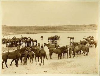 | Keywords: archives state records nsw staterecordsnsw newsouthwales blackandwhite horses kensington racecourse bushmen's contingent bushmenscontingent boer war boerwar soldiers outdoor black and white Watering horses - Bushmen's camp. Kensington Racecourse Dated: c.1900 Digital ID: 1254_a011_a011000007r Rights: www.records.nsw.gov.au/about-us/rights-and-permissions Part of the series 'New South Wales Bushmen's Contingent's departure to South Africa' Often known as 'mounted rifles', 'bushmen' or 'imperial bushmen' the images show the NSW Contingent. This series comprises photographs of the New South Wales Bushmen's Contingent departing for active service in the Cape Colony during the Boer War. There are photographs of the bushmen in the saddle on inspection parades, an officer on horseback, and a Bushman on horseback, plus scenes of camp life. View other images in Photo Investigator » We'd love to hear from you if you use our photos. Many other photos in our collection are available to view and browse on our website using Photo Investigator. Watering horses - Bushmen's camp. Kensington Racecourse Dated: c.1900 Digital ID: 1254_a011_a011000007r Rights: www.records.nsw.gov.au/about-us/rights-and-permissions Part of the series 'New South Wales Bushmen's Contingent's departure to South Africa' Often known as 'mounted rifles', 'bushmen' or 'imperial bushmen' the images show the NSW Contingent. This series comprises photographs of the New South Wales Bushmen's Contingent departing for active service in the Cape Colony during the Boer War. There are photographs of the bushmen in the saddle on inspection parades, an officer on horseback, and a Bushman on horseback, plus scenes of camp life. View other images in Photo Investigator » We'd love to hear from you if you use our photos. Many other photos in our collection are available to view and browse on our website using Photo Investigator. |