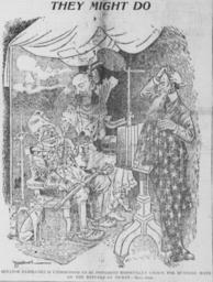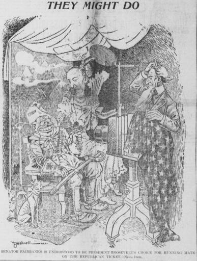 | Keywords: Bushnell cartoon about the pairing of Theodore Roosevelt and Charles Fairbanks.jpg Theodore Roosevelt 's then-rumored choice of Charles Fairbanks as his running mate for the United States presidential election 1904 1904 Presidential election Bushnell portrays Roosevelt and Fairbanks as sweethearts posing for a photograph to the consternation of Uncle Sam the photographer <p>Note that Fairbanks is dressed as a woman with a fan flowers a dress and high heels 1904-03-19 http //chroniclingamerica loc gov/lccn/sn88085187/1904-03-19/ed-1/seq-1/ The Tacoma Times Creator E A Bushnell other versions PD-old-70-1923 Uploaded with UploadWizard Cartoons by E A Bushnell Images from The Tacoma Times 1904 cartoons Theodore Roosevelt Uncle Sam |