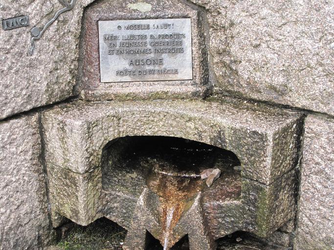 | Keywords: Bussang spring of Mosel river closeup.jpg en Closeup of the spring of the Mosel river in Bussang Vosges France On the plaque the text is Salutation to Mosel river illustrious mother in goods young warriors well educated people Ausone latin poet of the 4th century A C fr Détail de la source de la Moselle à Bussang Vosges Avec une plaque et un texte du poète latin Ausone own Tangopaso 2011-08-15 16 57 11 47 889518 6 892631 region FR_heading NE Moselle River Source Ausonius Plaques in Vosges |
