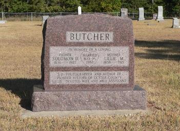 | Keywords: Butcher, Solomon and Lillie tombstone 1.JPG en Gravestone of Solomon D Butcher and Lillie M Butcher in Gates Cemetery Custer County Nebraska Camera is facing east 2015-09-23 own Ammodramus other versions cc-zero Uploaded with UploadWizard Pictures by Ammodramus Solomon D Butcher Gravestones in Nebraska 41 648583 -99 636424 |