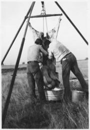 | Keywords: Butchering a buffalo - NARA - 285515.jpg Scope and content Skinning hanging the carcass staking out the hide and drying the meat General notes 285515 Local identifier Department of the Interior Bureau of Indian Affairs Pine Ridge Agency 09/17/1947 - 09/09/9999 NARA's Central Plains Region Kansas City NREA 400 West Pershing Road Kansas City MO 64108 other date ~ 1940 Record group Record Group 75 Records of the Bureau of Indian Affairs 1793 - 1999 Record group ARC 404 Education Decimal Files compiled 1937 - 1959 Series ARC 285492 File unit File unit ARC Variant control numbers NAIL Control Number NRE-75-PRSERIES175-1024 Other versions <gallery> File Butchering_a_buffalo_-_NARA_-_285515 tif tif File Butchering_a_buffalo_-_NARA_-_285515 jpg jpg </gallery> NARA-cooperation PD-USGov Buffalo butchering 1940 Butchers Buffalo Men at work in the United States Butchers Tripods Oglala Lakota Work South Dakota in the 1940s NARA images of South Dakota Work Black and white photographs of South Dakota Work |