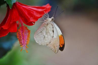 Keywords: butterfly animal insect nature animals brown white green leaves red beauty spring hibiscus orange background red flower