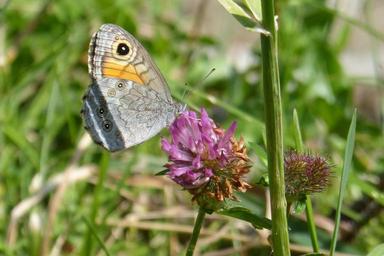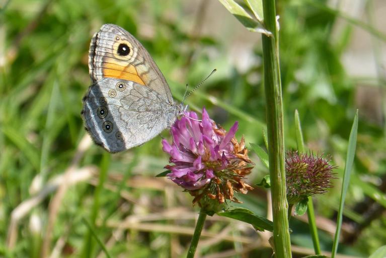 Keywords: butterfly brown eye lasiommata maera red clover underside of wings