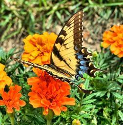Keywords: butterfly insect old world swallowtail yellow wings flowers marigold flora fauna