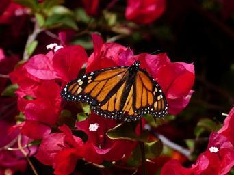 | Keywords: butterfly monarch butterfly danaus plexippus american monarch orange black butterflies edelfalter nymphalidae walking butterfly bougainvillea colorful flowers red intensive color bright bush bougainville triple flower four o'clock plant nyctaginaceae kahle hook flower bougainvillea glabra ornamental plant climber |