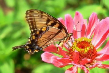 Keywords: butterfly zinnia swallowtail pink flower nature fauna garden blossom flora wing summer floral macro insect colorful sunshine petal spring outdoors natural