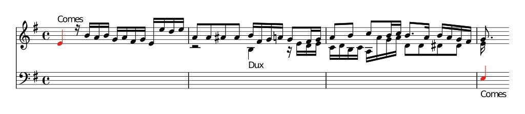 | Keywords: BuxWV142-Comes-Dux.svg de Dux und Comes von Fuge BuxWV 142 nach File BuxWV142-Comes-Dux GIF Erstellt mit LilyPond Dux and Comes or leader and follower in BuxWV 142 after File BuxWV142-Comes-Dux GIF Made with LilyPond Source Code <pre> \version 2 10 0 << Violinschlüssel Stimme 1 \clef violin \time 4/4 \key g \major \override NoteHead 'color red \override Stem 'color red e'4 Comes \override NoteHead 'color black \override Stem 'color black r16 b' a' b' g' a' fis' g' e' e d e a'8 a' ais' ais' b'16 fis' g' a' g'8 fis'16 g' \noBreak a'8 b' c b'16 c b'8 a'16 b' a' g' fis'\noBreak g'8 \\ Violinschlüssel Stimme 2 \clef violin \time 4/4 \key g \major s1 r2 b4_ Dux r16 e' d' e' c' d' b c' a a' g' a' d'8 d' dis' dis' e'16 Bassschlüssel \new Staff \clef bass \time 4/4 \key g \major s1 s s \override NoteHead 'color red \override Stem 'color red \stemUp e4_ Comes s4 s4 >> </pre> 2012-05-07 own Christian Stroppel SVG Brian Ammon File BuxWV142-Comes-Dux GIF cc-zero Sheet music of Dieterich Buxtehude Fugues |