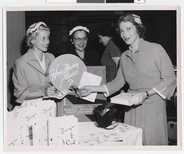 Keywords: jewish historical society of the upper midwest jewishhistoricalsocietyoftheuppermidwest minnesota digital library minnesotadigitallibrary social issues socialissues mt. sinai women's auxiliary collection mtsinaiwomensauxiliarycollection minneapolis hennepin minnesota united states unitedstates women standing three hats purchase buy 1952 1950s smiles books cookbooks The Mt. Sinai Auxiliary raised significant funds that were used towards patient care. Events included book sales, cookbook publishing and other social events, including the famous annual ball. Shown purchasing the cookbook is Luella Maslon, the book's author. Date: 1952 Source: 7.5 x 9.5 Format: Black and white professional photo Subject: Social issues; Mt. Sinai Women's Auxiliary Collection Coverage: Minneapolis; Hennepin; Minnesota; United States Local Identifier: MHS582 Link to our record: reflections.mndigital.org/u?/jhs,526 From the Steinfeldt Photography Collection of the Jewish Historical Society of the Upper Midwest. The Mt. Sinai Auxiliary raised significant funds that were used towards patient care. Events included book sales, cookbook publishing and other social events, including the famous annual ball. Shown purchasing the cookbook is Luella Maslon, the book's author. Date: 1952 Source: 7.5 x 9.5 Format: Black and white professional photo Subject: Social issues; Mt. Sinai Women's Auxiliary Collection Coverage: Minneapolis; Hennepin; Minnesota; United States Local Identifier: MHS582 Link to our record: reflections.mndigital.org/u?/jhs,526 From the Steinfeldt Photography Collection of the Jewish Historical Society of the Upper Midwest. |