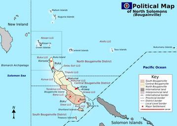 | Keywords: Bvdistricts.svg District map of Bougainville Province Papua New Guinea Own 2007 Isaac Sutcliffe Explanation of details This political map shows the of North Solomons or Bougainville Province which is an autonomous province of Papua New Guinea that is geographically located in the Solomon Islands forming a part of the Bismarck Archipelago southwest of New Ireland Papua New Guinea has five levels of government Federal Based in Port Moresby The National Government serves to address national and multinational issues Serving under the Queen of the Commonwealth this government is led by the Prime Minister who is elected by the people Provincial Each of Papua New Guinea's eighteen incorporated provinces and one autonomous province has a provincial government which has varying responsibilities depending on the province The provincial government is led by the Governor who is periodically elected by the people District Each of the provinces of Papua New Guinea has a number of districts The nation has 86 districts each led by a DOIC or District Officer in Charge The DOIC is often elected in the coastal areas and often appointed by the provincial government in the highlands The national capital of Papua New Guinea is located in a district that is not part of any province but is geographically located in Central Province called the NCD or National Capital District This arrangement can be considered similar to the District of Colombia in the United States of America A district has a population of about 40 000 to 250 000 LLGs or Local-Level Governments Each district has one or more Local Level governments which monitors and governs local issues There are 296 LLG areas each with a Mayor or President position which is sometimes appointed sometimes elected and sometimes not served A LLG generally has a population of about 2 000 to 50 000 LLGs tend to split when population exceeds 40 000 Wards Each Local Level Government Area has a number of wards there are approximately 22 000 wards in Papua New Guinea A ward can have a population of 10 to 1 500 people Districts Included in the map is the three major districts of the province North Bougainville Central Bougainville and South Bougainville This map demonstrates the areas of the Pacific Ocean and Solomon Sea that is controlled by these districts Districts are marked with a large maroon font LLGs Included in the map are the ten main island Local Government Areas and the two island Local Government Areas of Bougainville North Bougainville has the most LLG areas at six and Central Bougainville has the least at two LLGs are marked with a small maroon font in italics Islands Major Island groups and some major islands are marked on this map in black italics Settlements Major settlements are marked in a large black italic font and placed with a red dot The capital is not marked separately as the true provincial capital is disputed between Buka and Arawa Arawa is traditionally the provincial capital prior to the civil war of Bougainville which started in 1990 and officially ended in the year 2000 Maps of Bougainville Bougainville Island |