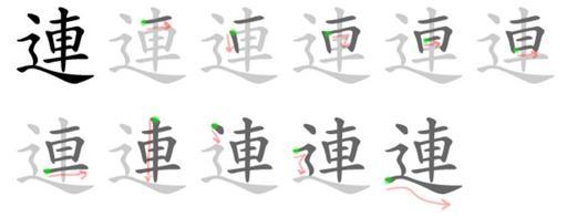 Keywords: 連-bw.png LIÁN v Link join connect Stroke count 10 11 with two dots Traditional stroke order Kai Shu style 2005-09-01 own assumed Kamlung~commonswiki Chinese kanji stroke order