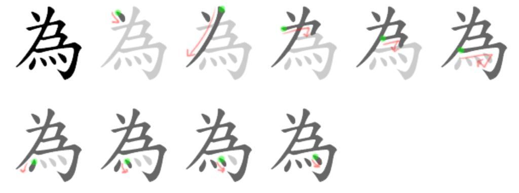 Keywords: 為-bw.png 為 WÉI v Do act; act as; become; be mean Stroke count 9 Alternate traditional form Kai Shu style 2005-09-03 own assumed Kamlung~commonswiki Chinese kanji stroke order