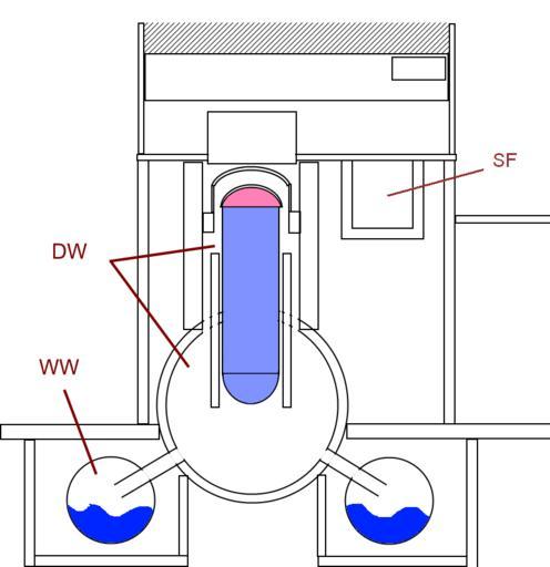 | Keywords: BWR Mark I Containment sketch.png en Rough sketch of a typical Boiling water reactor BWR Mark I Concrete Containment with Steel Torus as used in the BWR/1 BWR/2 BWR/3 and some BWR/4 model reactors DW Drywell WW Wetwell SF Spent fuel pool de Schema eines Siedewasserreaktors SWR der Baulinie Mark I mit Sicherheitsbehälter aus Beton und torusförmiger Kondensationskammer aus Stahl wie sie auch in Reaktoren der Baulinie SWR/1 SWR/2 SWR/3 und in einigen der Baulinie SWR/4 vorkommen DW Druckkammer WW torusförmige Kondensationskammer SF Abklingbecken fr Diagrame/coupe d'un réacteur à eau bouillante REB typique de type Mark I à enceinte de confinement en béton avec tore d'acier sous-jacent tel qu'utilisé dans les réacteurs de type REB/1 REB/2 REB/3 et certains REB/4 DW enceinte sèche WW enceinte humide de suppression de pression de forme torique SF piscine de combustible usé Sketched in Paint net using 826 x 852 canvas inspired by Page 15 pdf 40 Containment Integrity Research at Sandia National Laboratories - An Overview Manuscript completed March 2006 Published July 2006 id NUREG/CR-6906 and SAND2006-2274P http //www nrc gov/reading-rm/doc-collections/nuregs/contract/cr6906/cr6906 pdf - Prepared by Sandia National Laboratories for the U S Nuclear Regulatory Commission Job Code Y6757 The two diagrams on the same page are labeled Figure 5 Typical BWR Mark I Concrete Containment with Steel Torus User 84user 2011-03-14 <gallery>File BWR Mark I Containment diagram png original diagram from page 15 of the source File BWR Mark I Containment sketch with downcomers png sketch with downcomers </gallery> ImageNote 2 329 273 96 321 826 852 2 reactor pressure vessel ImageNoteEnd 2 ImageNote 3 314 382 16 231 826 852 2 Cylindrical biological shield ImageNoteEnd 3 ImageNote 4 332 277 92 34 826 852 2 Top head assembly ImageNoteEnd 4 ImageNote 6 215 94 462 67 826 852 2 Gantry crane ImageNoteEnd 6 ImageNote 7 311 167 135 80 826 852 2 Drywell head and refueling assembly ImageNoteEnd 7 ImageNote 8 233 240 293 518 826 852 2 Inverted lightbulb drywell containment chamber ImageNoteEnd 8 ImageNote 9 208 34 474 199 826 852 2 Upper part of building housing crane and refueling assembly ImageNoteEnd 9 ImageNote 10 92 683 567 138 826 852 2 Wetwell torus holding water for steam suppression ImageNoteEnd 10 Schemata of boiling water reactor |