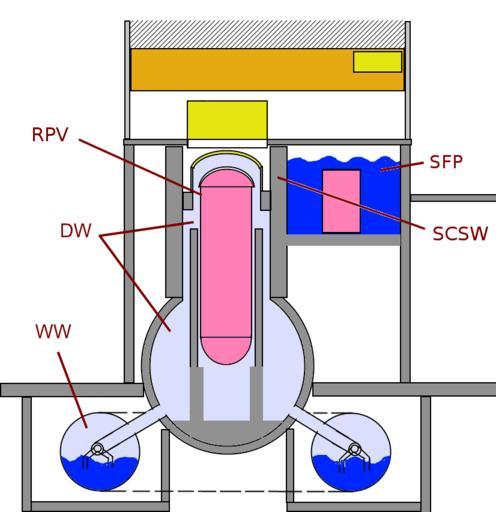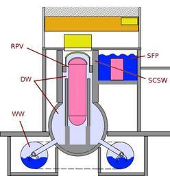 | Keywords: BWR Mark I Containment sketch with downcomers.png en Rough sketch of a typical Boiling water reactor BWR Mark I Concrete Containment with Steel Torus including downcomers as used in the BWR/1 BWR/2 BWR/3 and some BWR/4 model reactors DW Drywell WW Wetwell SFP Spent Fuel Pool RPV Reactor Pressure Vessel SCSW Secondary Concrete Shield Wall fr Diagramme/coupe d'un réacteur à eau bouillante REB typique de type Mark I à enceinte de confinement en béton avec tore d'acier sous-jacent tel qu'utilisé dans les réacteurs de type REB/1 REB/2 REB/3 et certains REB/4 es Diagrama/corte esquemático de un reactor de agua en ebullición tipico del tipo Mark I con recinto de contención en hormigón con toro subyacente en acero como los utilizados en los reactores de tipo BWR/1 BWR/2 BWR/3 y algunos BWR/4 ca Esquema d'un reactor d'aigua en ebullició BWR Boiling water reactor de tipus Mark I amb contenció de formigó i torus d'acer incloent baixants com els utilitzats en els models de reactor BWR/1 BWR/2 BWR/3 i alguns BWR/4 DW Pou sec WW Pou moll SFP Piscina del combustible gastat RPV Vas a pressió del reactor SCSW Paret secundària amb blindatge de formigó Sketched in Paint net using 826 x 852 canvas inspired by Page 15 pdf 40 Containment Integrity Research at Sandia National Laboratories - An Overview Manuscript completed March 2006 Published July 2006 id NUREG/CR-6906 and SAND2006-2274P http //www nrc gov/reading-rm/doc-collections/nuregs/contract/cr6906/cr6906 pdf - Prepared by Sandia National Laboratories for the U S Nuclear Regulatory Commission Job Code Y6757 The two diagrams on the same page are labeled Figure 5 Typical BWR Mark I Concrete Containment with Steel Torus User 84user 2011-03-16 <gallery> File BWR Mark I Containment sketch with downcomers svg SVG version File BWR Mark I Containment diagram png original diagram from page 15 of the source File BWR Mark I Containment sketch png sketch without downcomers File BWR Mark I Containment sketch primary png primary containment outlined in purple File Reaktor svg detalied SVG version </gallery> ImageNote 2 329 273 96 321 826 852 2 reactor pressure vessel ImageNoteEnd 2 ImageNote 3 314 382 16 231 826 852 2 Cylindrical biological shield ImageNoteEnd 3 ImageNote 4 332 277 92 34 826 852 2 Top head assembly ImageNoteEnd 4 ImageNote 7 311 167 135 80 826 852 2 Drywell head and refueling assembly ImageNoteEnd 7 ImageNote 8 233 240 293 518 826 852 2 Inverted lightbulb drywell containment chamber ImageNoteEnd 8 ImageNote 9 208 34 474 199 826 852 2 Upper part of building housing crane and refueling assembly ImageNoteEnd 9 ImageNote 10 92 683 567 138 826 852 2 Wetwell torus holding the suppression pool of water to handle excess steam vented from the reactor above ImageNoteEnd 10 ImageNote 11 483 245 181 144 826 852 2 Spent fuel pool area highly simplified here ImageNoteEnd 11 ImageNote 12 216 78 458 74 826 852 2 Gantry crane ImageNoteEnd 12 ImageNote 13 554 740 69 57 826 852 2 Downcomer tubes duct the steam below the water surface so that it condenses thereby reducing the pressure ImageNoteEnd 13 BWR Mark I Containment sketch with downcomers svg Schemata of boiling water reactor |