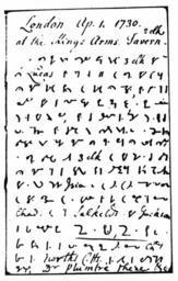 | Keywords: Byrom shorthand 1730.png en John Byrom's shorthand writing in his own shorthand system Transcription I came here from Cambridge last Friday 3 o'clock with Mr Lucas We set out 11 and came to Ware that night My horse tired with me and tired me severely We lay at the Crown where the man's daughter has just died I was sick but it were of God We had beginners to supper but I had no stomach We talked of moral fortitude I spoke to my landlord for another horse which he got me next morning I came to London about 3 o'clock and went after I had left my horse at the Dolphin Went to Bishopsgate Timing sad betimes where I found brother Josiah and by the bye sister Anne came Willy Chaddock and I drank tea there and called at cousin Chad And at Salkeld's where Jackson the town clerk was Surprise I went surprise I would I thence home to the new coffee house by cousin Chaddock's Thence to North's coffee hse to read the Grub street journal Dr Plumtre there etc Shorthand notes by John Byrom reprinted in Joy Hancox's book The Queen's Chameleon page 81 John Byrom 1692-1763 1730 Byrom's shorthand PD-old-100 |