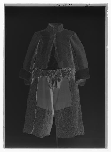 Keywords: Byxor av brunaktig grå, oskuren sammet som tillhört Karl X Gustav (1622-1660), ca 1650 - Livrustkammaren - 18481-negative.tif Byxorna är av samma grå oskurna sammet som kappan och av rak modell De är gjorda av 4 stycken som förutom sidorna sytts samman fram och bak Mitt framtill är ett c a 30 cm långt sprund som knäpps med en 25 cm lång knäppslå Byxorna är med glesa rynkor fästade vid en 122 cm lång linning - försedd med blott en enda skarv Denna har 6 metallhakar vilka genom fodret på baksidan trätts genom linningen I linningen återstår för närvarande blott de 5 cm långa knapphålen ty de 2 knapparna saknas I knäppslån sitter 8 st knapphål 2 cm långa sydda av 2 trådar av brunt högertvinnat silke med 5 stygn/cm Samma antalknappar finns kvar på motstående sida De är av samma sort som tröjans guld- och silvertrådsklädda knappar Byxorna har i sidsömmarna 17 cm långa sprund för de stora ficksäckarna av skinn Dessa liksom knäppslån är fodrade med samma slags brokad som tröjansfoder <br/><br/>Anmärkningsvärt är att dessa byxor saknar såväl den vanligen förekommande lilla urfickan i linningen på vänster sida framtill som den mindre vertikala fickan på högra framsidan Byxorna är på insidan fodrade med vit linnelärft c a 26x23 tr/cm2 mellanfoder saknas Byxorna är garnerade med en 15 5 cm bred oliksidig knypplad uddspets av guld- och silvertråd samma slag som på kappan Den är påsydd i 2 rader nertill runt benen samt 1rad på varje sida om sidsömmen Som garnering har dessutom bandrosetter sytts fast runt hela midjan delvis på och delvis strax under linningen <br/><br/>Nu finns 20 st sådana rosetter samt något längre ner framtill 3 rosetter på vänster sida och 2 på höger Spår efter ytterligare 2 rosetter finns på linningen och vidare bör det ha funnits en rosett som sprättats bort från höger sida M a o det stämmer bra med 1671 års inventarium som omtalar 28 st silver- guld- och silkesband Rosetterna har knutits i 2 öglor och 2 ändar dels av ett bredare band i silver och mörk olivfärgat silke b 3 3 cm delas av ett smalare band knutet på samma sätt i övervägande vitt och silver b 1 2 cm Bandåtgången kan beräknas till varje rosett av det breda bandet har dragit c a 58 cm varje rosett av det smala bandet har dragit c a 56 cm Om det ursprungligen funnits 28 rosetter har bandåtgången varit 16 24 meter för breda band och 15 68 meter för smala band <br/><br/>Där spetsgarneringen fastsytts har man under sammeten lagt in ett foder av grövre vävnad På höger framsida har byxorna ett urbränt stycke i linnefodret Likaså är hål brända på byxornas insida vid hakarna närmast fickorna Vid något senare tillfälle har man lagt ett veck framtill på varje sida på linningen och 2 hyskor och hakar har sytts fast Byxorna är märkta med bläck baktill N 44 samt har en lapp med inskr 34 Det förra numret från 1789-90 års inventarium det senare till 1821 1850 och 1855 års inv original caption 1647 velvet Färg grå d1 - dräkt - yttermaterial material sammet size cm 122 midjemått LRK Karl X Gustav av Sverige Tre Karlar 1984-1985 Kungligt klädd 1987-1989 Modelejon 2002 place of origin original filename LN_B10722_013602 56375 inventory number LRK 19830 18481 CC0 Byxor av brunaktig grå oskuren sammet som tillhört Karl X Gustav 1622-1660 ca 1650 - Livrustkammaren - 18481 tif <gallery caption Different images of same object > File Byxor av brunaktig grå oskuren sammet som tillhört Karl X Gustav 1622-1660 ca 1650 - Livrustkammaren - 9919 tif File Byxor av brunaktig grå oskuren sammet som tillhört Karl X Gustav 1622-1660 ca 1650 - Livrustkammaren - 78404 tif File Byxor av brunaktig grå oskuren sammet som tillhört Karl X Gustav 1622-1660 ca 1650 - Livrustkammaren - 1359 tif </gallery>