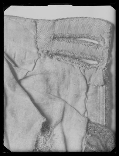 | Keywords: Byxor av guldlamé helt täckt av guldbroderi - Livrustkammaren - 28265.tif LSH artwork sv Dräkten beställdes 1654 från Frankrike genom Magnus Gabriel de la Gardie inför festligheterna vid Karl X Gustavs kröning och efterförljande bröllop Byxor av rak modell De är sydda av 4 egentliga huvudbeståndsdelar som dock försetts med skarvar av något varierande storlek nertill horisontellt för att öka längden samt vertikala ökningstycken framtill vid sprundet och på motsvarande ställen baktill och slutligen nertill vid byxbenens inre sömmar Ursprungsmaterialet är gul filemort oskuren sammet men skarvstyckena är något mörkare med dragning åt rött i färgen Ursprungsmaterialets vådbredd är minst 43 cm 14 rader oskurna öglor på rätan Byxorna har raka sömmar i sidorna och svagt sneddade fram och baksömmar Framtill är ett 34 cm långt sprund När sprundens längd angives i texten inbegripes aldrig linningen med en c a 29 cm lång knäppslå med 12 knapphål knäppslån följer i hela sin längd det iskarvade mörkare stycket framtill Byxorna är något rynkade vid den 127 5 cm långa linningen som också försetts med flera skarvar baktill I denna finns de 2 stora 2 1 cm i diam guldtrådsklädda knapparna kvar De knäpps med de 4 cm långa knapphålen på vänster framsida I linningen finns 7 st silverhakar kvar den främsta på vänster sida som skulle träs genom det lilla tränsade hålet vid urfickan saknas Linningen är gjord av något grövre oskuren sammet Linningsknapparna är av samma typ som den som finns kvar i byxorna till dräkt nr 3418 De 2 stora byxfickorna har 22 5 cm långa vertikala sprund i sidsömmarna Ficksäckarna är av skinn På höger framstycke finns också en mindre ficka med vertikalt sprund 19 cm från framkanten räknat Dessa 3 fickor har stoffering med gul moiré samma sort som också begagnats i fickan på byxlinningen till dräkt nr 3418 Knapphålsslån är på rätan gjord av guldbrokad av samma sort som tröjans foder och av relativt mörk sammet på baksidan De 2 cm långa knapphålen är sydda med 8 stygn/cm av gult högertvinnat silke Ficksprunden och knäppslån samt sprunden vid framkanterna är skodda med kastanjebrunt ripsband 14 inslagstr/cm Mellanfoder finns ej i byxorna men de har innerfoder av ursprungligen vit linnelärft 28x28 tr/cm2 Nedtill kan man i fodret se hål efter stygn ca 3 5 cm från kanten som tyda på att en slå eller skoning varit sydd på insidan Byxorna har garnerats med spets knypplad av guldtråd och med inlagda guldlan - samma typ som på tröjan Analysresultat Metalltråd av förgyllt silver legerat med koppar huvudbeståndsdelar Silver xxxGuld xxKoppar xxxZink 0Numera finns det spets kvar blott nedtill vid benen ca 1 8 cm bred Den är knypplad av ljusgul silkeskärna med högertvinnad guldlan samt 2 bandformiga lan varav en ligger intill spetsens stadkant och en i vinkelböjning lanen är 2 mm bred Förutom av spetsen nertill garneras byxorna av rosetter framtill av vilka de ursprungliga 5 alltjämt finns kvar på varje sida 3 i en övre horisontell rad och 2 därunder Rosetterna består dels av ett 2 5 cm brett metalltrådsband med 2 atlasränder av rött silke ca 18 inslagstr/cm som knutits i 3 öglor varje ögla 16 á 17 cm lång samt dels ett 4 2 cm brett metalltrådsband med bl a mönstervävda ränder i brunt silke 17 inslagstr/cm som också knutits i 3 öglor c a 16 cm i varje ögla Analysresultat band huvudbeståndsdelar Silver xxxGuld 0Koppar xZink 0På byxornas bakstycken finns ett par vertikala uppklipp ca 15 cm långa som sytts ihop På vänster sida framtill i linningen är byxorna på insidan märkta med bläck N 39 i 1789-90 års inv och de är urbrända i jämnhöjd med knapphålsslån ett stycke in i fodret Beträffande broderiets karaktär kan nämnas att de mörkare partierna skarvats om till det ursprungliga plagget har broderats med visserligen samma mönster men mer utdraget glesare och spretigare och samtidigt svulstigare och man har tydligen inte vetat vilka mönsterdetaljer som är huvudsakliga och vilka som är underordnade Sålunda har palmbladskvistarna vanligen 4 kvistar åt resp håll på det ursprungliga broderiet men oftast blott 3 på de mörkare partierna Bladkvistarna har i de nyare - sekundära mörkare styckena blivit lika breda nedtill som upptill vilket också utgör en skillnad mot det ursprungliga broderiet Vidare är bågarna som hålla palmkvistarna mer svängda och har 7 jämnstora kulor över sig Man har dock i de tillskarvade partierna låtit mönstret fortsätta på det mest eleganta sätt Blott i sidsömmarna stämma mönstren numera ej överens men här har ju en spets dolt sömmen Det gamla broderiet verkar därtill gulare I byxornas nederkant fortsätter broderiet i det lilla upp- och invikta stycket Här har man alltså haft en ytterligare marginal att släppa på Broderiet har ej avpassats efter plaggets form med någon avslutande bård eller dylikt nedtill det är helt yttäckande och följer materialets riktning original caption Karl X Gustavs kröning 1654 linen Färg vit d2 - dräkt - foder material linnelärft - velvet Färg gul röd d1 - dräkt - yttermaterial material sammet size mm 127 5 midjemått LRK Karl X Gustav av Sverige Tre Karlar 1984-1985 Sweden - A Royal Treasury 1988-1989 Modelejon 2002 Les arts décoratifs sous Louis XIII 2002 Sweden and Europe 1632-1792 2003-2004 Fest och fritid vid hovet 2003 Livrustkammaren nya basutställning 2018 LRK bas 2018 Livrustkammaren place of origin original filename LN_E04579 67902 inventory number LRK 31309 28265 CC0 Byxor av guldlamé helt täckt av guldbroderi - Livrustkammaren - 28265-negative tif <gallery caption Different images of same object > File Byxor av guldlamé helt täckt av guldbroderi - Livrustkammaren - 11141 tif File Byxor av guldlamé helt täckt av guldbroderi - Livrustkammaren - 45384 tif File Byxor av guldlamé helt täckt av guldbroderi - Livrustkammaren - 2581 tif