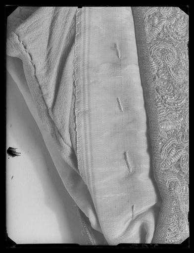 | Keywords: Byxor av guldlamé helt täckt av guldbroderi - Livrustkammaren - 11141.tif LSH artwork sv Dräkten beställdes 1654 från Frankrike genom Magnus Gabriel de la Gardie inför festligheterna vid Karl X Gustavs kröning och efterförljande bröllop Byxor av rak modell De är sydda av 4 egentliga huvudbeståndsdelar som dock försetts med skarvar av något varierande storlek nertill horisontellt för att öka längden samt vertikala ökningstycken framtill vid sprundet och på motsvarande ställen baktill och slutligen nertill vid byxbenens inre sömmar Ursprungsmaterialet är gul filemort oskuren sammet men skarvstyckena är något mörkare med dragning åt rött i färgen Ursprungsmaterialets vådbredd är minst 43 cm 14 rader oskurna öglor på rätan Byxorna har raka sömmar i sidorna och svagt sneddade fram och baksömmar Framtill är ett 34 cm långt sprund När sprundens längd angives i texten inbegripes aldrig linningen med en c a 29 cm lång knäppslå med 12 knapphål knäppslån följer i hela sin längd det iskarvade mörkare stycket framtill Byxorna är något rynkade vid den 127 5 cm långa linningen som också försetts med flera skarvar baktill I denna finns de 2 stora 2 1 cm i diam guldtrådsklädda knapparna kvar De knäpps med de 4 cm långa knapphålen på vänster framsida I linningen finns 7 st silverhakar kvar den främsta på vänster sida som skulle träs genom det lilla tränsade hålet vid urfickan saknas Linningen är gjord av något grövre oskuren sammet Linningsknapparna är av samma typ som den som finns kvar i byxorna till dräkt nr 3418 De 2 stora byxfickorna har 22 5 cm långa vertikala sprund i sidsömmarna Ficksäckarna är av skinn På höger framstycke finns också en mindre ficka med vertikalt sprund 19 cm från framkanten räknat Dessa 3 fickor har stoffering med gul moiré samma sort som också begagnats i fickan på byxlinningen till dräkt nr 3418 Knapphålsslån är på rätan gjord av guldbrokad av samma sort som tröjans foder och av relativt mörk sammet på baksidan De 2 cm långa knapphålen är sydda med 8 stygn/cm av gult högertvinnat silke Ficksprunden och knäppslån samt sprunden vid framkanterna är skodda med kastanjebrunt ripsband 14 inslagstr/cm Mellanfoder finns ej i byxorna men de har innerfoder av ursprungligen vit linnelärft 28x28 tr/cm2 Nedtill kan man i fodret se hål efter stygn ca 3 5 cm från kanten som tyda på att en slå eller skoning varit sydd på insidan Byxorna har garnerats med spets knypplad av guldtråd och med inlagda guldlan - samma typ som på tröjan Analysresultat Metalltråd av förgyllt silver legerat med koppar huvudbeståndsdelar Silver xxxGuld xxKoppar xxxZink 0Numera finns det spets kvar blott nedtill vid benen ca 1 8 cm bred Den är knypplad av ljusgul silkeskärna med högertvinnad guldlan samt 2 bandformiga lan varav en ligger intill spetsens stadkant och en i vinkelböjning lanen är 2 mm bred Förutom av spetsen nertill garneras byxorna av rosetter framtill av vilka de ursprungliga 5 alltjämt finns kvar på varje sida 3 i en övre horisontell rad och 2 därunder Rosetterna består dels av ett 2 5 cm brett metalltrådsband med 2 atlasränder av rött silke ca 18 inslagstr/cm som knutits i 3 öglor varje ögla 16 á 17 cm lång samt dels ett 4 2 cm brett metalltrådsband med bl a mönstervävda ränder i brunt silke 17 inslagstr/cm som också knutits i 3 öglor c a 16 cm i varje ögla Analysresultat band huvudbeståndsdelar Silver xxxGuld 0Koppar xZink 0På byxornas bakstycken finns ett par vertikala uppklipp ca 15 cm långa som sytts ihop På vänster sida framtill i linningen är byxorna på insidan märkta med bläck N 39 i 1789-90 års inv och de är urbrända i jämnhöjd med knapphålsslån ett stycke in i fodret Beträffande broderiets karaktär kan nämnas att de mörkare partierna skarvats om till det ursprungliga plagget har broderats med visserligen samma mönster men mer utdraget glesare och spretigare och samtidigt svulstigare och man har tydligen inte vetat vilka mönsterdetaljer som är huvudsakliga och vilka som är underordnade Sålunda har palmbladskvistarna vanligen 4 kvistar åt resp håll på det ursprungliga broderiet men oftast blott 3 på de mörkare partierna Bladkvistarna har i de nyare - sekundära mörkare styckena blivit lika breda nedtill som upptill vilket också utgör en skillnad mot det ursprungliga broderiet Vidare är bågarna som hålla palmkvistarna mer svängda och har 7 jämnstora kulor över sig Man har dock i de tillskarvade partierna låtit mönstret fortsätta på det mest eleganta sätt Blott i sidsömmarna stämma mönstren numera ej överens men här har ju en spets dolt sömmen Det gamla broderiet verkar därtill gulare I byxornas nederkant fortsätter broderiet i det lilla upp- och invikta stycket Här har man alltså haft en ytterligare marginal att släppa på Broderiet har ej avpassats efter plaggets form med någon avslutande bård eller dylikt nedtill det är helt yttäckande och följer materialets riktning original caption Karl X Gustavs kröning 1654 linen Färg vit d2 - dräkt - foder material linnelärft - velvet Färg gul röd d1 - dräkt - yttermaterial material sammet size mm 127 5 midjemått LRK Karl X Gustav av Sverige Tre Karlar 1984-1985 Sweden - A Royal Treasury 1988-1989 Modelejon 2002 Les arts décoratifs sous Louis XIII 2002 Sweden and Europe 1632-1792 2003-2004 Fest och fritid vid hovet 2003 Livrustkammaren nya basutställning 2018 LRK bas 2018 Livrustkammaren place of origin original filename LN_E04577 67902 inventory number LRK 31309 11141 CC0 Byxor av guldlamé helt täckt av guldbroderi - Livrustkammaren - 11141-negative tif <gallery caption Different images of same object > File Byxor av guldlamé helt täckt av guldbroderi - Livrustkammaren - 19703 tif File Byxor av guldlamé helt täckt av guldbroderi - Livrustkammaren - 79627 tif File Byxor av guldlamé helt täckt av guldbroderi - Livrustkammaren - 45384 ti