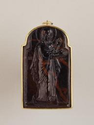 | Keywords: Byzantine - Cameo of the Virgin - Walters 425 - Obverse.jpg This small and delicately carved bloodstone cameo shows the Virgin standing and turning to her left her arms raised in a gesture of prayer or supplication An abbreviated inscription on either side identifies her as the Mother of God She is perhaps imploring her son to forgive the sins of humanity and the original owner of this work no doubt hoped that she was interceding specifically on his or her behalf The gold frame around the piece is modern and it is unclear whether this small work was originally meant to be worn around the neck like many other carved Byzantine gems or whether it was part of a small devotional diptych or triptych arranged so that this panel was next to one depicting Christ with the Virgin therefore directly gesturing toward her son The image is carved on a bloodstone The red streaks in this stone would have reminded pious viewers of the blood shed by Christ at the Crucifixion perhaps focusing their thoughts on Mary's role at that event ca 900 Medieval bloodstone chalchedony gold cm 5 7 3 0 6 accession number 42 5 33762 Leon Gruel Paris by purchase Henry Walters city Baltimore Walters Art Museum Henry Walters Acquired by Henry Walters 1928 Early Christian and Byzantine Art Baltimore Museum of Art Baltimore 1947 The Glory of Byzantium The Metropolitan Museum of Art New York 1997 Realms of Faith Medieval and Byzantine Art from the Walters Art Museum Frist Center for the Visual Arts Nashville 2001-2002 Realms of Faith Medieval and Byzantine Art from the Walters Art Museum Frist Center for the Visual Arts Nashville 2002-2005 Realms of Faith Medieval and Byzantine Art from the Walters Art Museum Museum of Biblical Art New York; Colby College Museum of Art Waterville; Joslyn Art Museum Omaha 2008-2009 place of origin Constantinople present-day Istanbul Turkey left thumb Reverse Walters Art Museum license Byzantine and Early Russian art in the Walters Art Museum Byzantine cameos Jewellery of Virgin Mary Heliotrop Cameos |