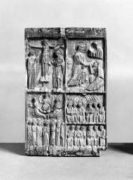 | Keywords: Byzantine - Crucifixion, Harrowing of Hell, Ascension, and Pentecost - Walters 71137.jpg The compositions of the Crucifixion and the Ascension on this piece are almost identical to those on Walters 71 244 and 71 294 but the style is late Byzantine Unusual details include the way the angels' legs turn outward while their bodies face inward toward the ascending Christ and the extraordinary floating half-length figure of Eve behind Adam in Hell The pierced holes show that the plaque was the center of a triptych There are some losses in the Crucifixion scene in the borders and in the lower right corner There is a vertical crack down the left side of the piece held together at the top and bottom by silver plates The ivory is brownish in color Later inscriptions in Greek have been added to the background century 14 Medieval ivory elephant cm 14 2 8 9 0 9 accession number 71 137 16123 Léon Gruel Paris date and mode of acquisition unknown Henry Walters city Baltimore Walters Art Museum Henry Walters Acquired by Henry Walters 1929 Cross References Dumbarton Oaks Washington 2011 place of origin Byzantine Empire Walters Art Museum license Byzantine ivory in the Walters Art Museum Decorative and applied arts of Byzantine Empire Media contributed by the Walters Art Museum needs category review |