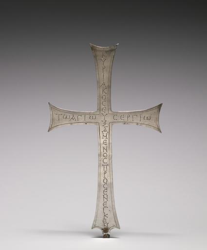 Keywords: Byzantine - Processional or Altar Cross - Walters 57632.jpg Originally this cross had pendelia jewels crosslets or Greek letters suspended from the four holes in its horizontal arms Like other medium-sized crosses with a tang this one could have been carried in procession or affixed in a stand or both 3rd quarter 6th century Late Antique silver silver sulfide inlay and copper alloy repairs cm 40 2 20 6 ; H without tang cm 33 8 accession number 57 632 17709 Excavated in Syria 1908-1910 Tawfic Abucasem Hama and Port Said ca 1913 by purchase Joseph Brummer Paris ca 1928 by purchase Henry Walters city Baltimore Walters Art Museum Henry Walters Acquired by Henry Walters 1929 Translation Having prayed Cyriacus presented this to Saint Sergius Early Christian and Byzantine Art Baltimore Museum of Art Baltimore 1947 Illuminated Manuscripts Masterpieces in Miniature The Walters Art Gallery Baltimore 1984-1985 Silver Treasure from Early Byzantium The Walters Art Gallery Baltimore 1986 place of origin northwest Bulgaria Walters Art Museum license Byzantine silver in the Walters Art Museum Byzantine crucifixes Media contributed by the Walters Art Museum needs category review |
