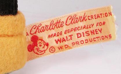 Keywords: C CLARK label.jpg en This embroidered label is attached to the hand crafted WALT DISNEY character dolls created by Charlotte Clark Photo collection from Dawn N Ericson Dawn Navarro Ericson 2009-01 Charlotte Clark
