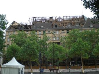 Keywords: C-haus.jpg en Haus Cumberland on Kurfürstendamm Berlin Germany roof damage from fire being repaired own Bukk 2011-05-27 Cc-zero Haus Cumberland Roof construction Fire damage