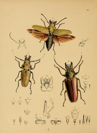 | Keywords: CabinetOrientalEntomology23.jpg en ORDER ”COLEOPTERA Section ”Longicorns Family ”Trictenotomidae Westw The first notice of the type of this very anomalous group of insects appeared in a note appended to a paper of mine in the I8-th number of the Zoological Journal published in 1S30 in which I regarded it as a connecting link between the Prionidae and Lucanidae agreeing with the former in its general appearance short trigonate advanced mandibles and moderately long antenna whilst in the internally produced structure of the three terminal joints of the antennae it agrees with Lucanus observing moreover that the joints of the tarsi are cylindric as in the latter but the insect is heteromerous Shortly afterwards a figure of the type Trictenotoma Childrenii was pubhshed from a drawiug of mine in the plates to Griffith's edition of the Animal Kingdom and M Guerin Meneville also gave a figure of it in his Magasin de Zoologie pi 35 with a notice by M Dupont in which the position of the genus was considered to be en tete des Longicornes famille on par tous ses rapports il entre tout naturellement During the period which has since elapsed no further attempt has been made to investigate the affinities of the genus by an examination of its structural characters Having however recently received a specimen of T Childrenii from Assam by the kindness of Major Jenkins and two other new and very distinct species having also been recently received in this country I have submitted the whole to a careful investigation the result of which is before the student in the accompanying plate From the considerations derived from the structure not only of the mouth organs but also the position of the wing veins and numerical arrangement of the abdominal segments I have no longer any hesitation in referring the insect to the section Longicornes notwithstanding the internally produced terminal joints of the antennae which is too trivial a character to be considered of high importance in limiting the groups the heteromerous tarsi and the structure of the organs of generation Moreover its nearest affinities appear to be the Prionidae especially in the poi-rected head and mandibles moderately short antennae slightly emarginate eyes and wing veins From these however it difi'ers in several respects so that I have considered it more natural to regard it as the type of a distinct family which may be thus characterised TRICTENOTOMIDAE Westw Head horizontal ; eyes transverse slightly emarginate behind the base of the antennae ; labrum short transverse; mandibles porrected nearly alike in both sexes Maxillae with the inner lobe scarcely produced outer lobe long narrow and haiiy ; mentum broad with the sides elevated ; labium short bipartite ; antennae moderately long ; those of the males rather more elongated ; three terminal joints internally serrated Pronotiun with the hind margin lobed in the middle ; wings folded at about threefourths of theii length from the base ; abdomen with seven dorsal and five ventral segments ; the terminal dorsal segment in the male notched ; the terminal ventral segment in the same sex more deeply I 2 notched ; the last dorsal segment of the female elongate-conic and notched ; the last ventral segment in the same sex entire ; ventral surface of the sheath of the male organs deeply notched ; the latter furnished with two long slender horny filaments ; sheath of the ovipositor of the female flattened and furnished with two slender hairy filaments; legs moderately long; all the tibice entire along the external margin and with two minute apical spurs ; tarsi sub-cylindric heteromerous the underside of each joint clothed with a short velvety pad ; body more or less clothed with a delicate pubescence The family consists at present of the single genus Trictenotoma of which I have now the pleasure to describe three species FIGURES I 2 ”Species 1 TRICTENOTOMA CHILDRENII G R Gray in Griflf An K pl 5 5 3 Trictenotoma nigra supra undique griseo-luteo pubescens mandibulis in utroque sexu subfalcatis antennis pedibus maculisque duabus elevatis prouoti nigris hujus lateribus sub-angulatis scutello triangiilari Trictenotoma blael; covered on the upper surface nitU luteous-grey pubescence the mandibles in both sexes subfalcate antennse legs and two elevated spots on the pronotum black ; the sides of the latter somewhat angulated ; and the scutellum triangular Length of the insect 11 to 2J inches Inhabits various pai-ts of India In the Collections of the British Museum Zoological Society Hope Pan-y Westwood c Figure 1 The female of the natural size; la the last ventral segment of the abdomen with the last dorsal segment extending beyond its extremity; lb Ic sheath of the ovipositor Figure 2a head of the male; 2b maxilla 1 cardo 2 stipes 3 mando 4 squama palpigera 5 galea 6 palpus 2c 2d 2e instrumenta labiaHa in different positions; 2 f under-side of abdomen of this sex; 2g under-side of sheath; 2h last dorsal segment of abdomen; 2i upper side of sheath; 2 k 21 inner sheath ; 2 m male organ; 2 n apex of ditto FIGURE 3 ”Species 2 TRICTENOTOMA TEMPLETONII Westw J Trictenotoma nigra supra luteo-albido pubescens mandibulis maris e vtus viilde sinuatis dente magno subapicali erecto armatis antennis pedibus maculisque duabus elevatis pronoti nigris hujus lateribus angulatis scutello triangulari Trictenotoma black above clothed «ith a luteous-buff pubescence the mandibles of the male outwardly much sinuated and ai-med near the apex with a large upright tooth ; the antenna; legs and two elevated spots on the pronotum shining black the sides of the latter angulated and the scutellum triangular Length of the insect nearly 2J inches Inhabits the island of Ceylon In the Collection of R Templeton Esq Figure 3 The male of the natural size; 3 a the last ventral segment of the abdomen showing the extremity of the last dorsal segment which is scarcely emarginate; 3 b the under-side of the sheath 3c male organ; 
