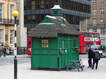 | Keywords: outdoor The Cabmen's Shelter Fund was established in London, England, in 1875 to run shelters for the drivers of hansom cabs and later hackney carriages (taxicabs).[1] By law, cab drivers could not leave the cab stand while their cab was parked there. This made it very difficult for them to obtain hot meals and could be unpleasant in bad weather. If they drove to a pub to buy food then they would have to pay somebody to look after their cab while they were inside, otherwise it was likely to be stolen. The Earl of Shaftesbury and other worthies therefore took it upon themselves to set up a charity to construct and run shelters at major cab stands. These shelters were small green huts, which were not allowed to be larger than a horse and cart, as they stood on the public highway. Between 1875 and 1914, 61 of these buildings were built around London. Most were staffed by an attendant who sold food and (non-alcoholic) drink to the cabbies and were provided with a kitchen in which the attendant could cook this food and also food provided by the cabbies themselves. The attendant was not generally paid, but was expected to make an income from these sales. The shelters were also provided with seats and tables and books and newspapers, most of them donated by the publishers or other benefactors. Most could accommodate ten to thirteen men. Gambling, drinking and swearing were strictly forbidden. Thirteen of the shelters still exist and are still run by the Cabmen's Shelter Fund.[2] All are now Grade II listed buildings. They are located at: Chelsea Embankment SW3 - close to junction with Albert Bridge, London Embankment Place WC2 - close to the Playhouse Theatre Grosvenor Gardens SW1 - to the west side of the north gardens Hanover Square, London W1 - on the north side of the central gardens Kensington Park Road W11 - outside numbers 8-10 Kensington Road W8 - close to the junction of Queen's Gate SW7 Pont Street SW1 - close to the junction of Sloane Street Russell Square WC1 - Western Corner (relocated to here from Leicester Square) St. George's Square, Pimlico SW1 - on the north side Temple Place WC2 - opposite side of the road from the Swissötel Howard Thurloe Place, Kensington SW7 - in the middle of the road opposite the Victoria and Albert Museum Warwick Avenue, London W9 - centre of the road, by Warwick Avenue tube station Wellington Place NW8 - near to Lord's Cricket Ground During annual Open House London Heritage Days, the public gets a chance to see inside some of the shelters, normally the exclusive reserve of cab drivers. The Cabmen's Shelter Fund was established in London, England, in 1875 to run shelters for the drivers of hansom cabs and later hackney carriages (taxicabs).[1] By law, cab drivers could not leave the cab stand while their cab was parked there. This made it very difficult for them to obtain hot meals and could be unpleasant in bad weather. If they drove to a pub to buy food then they would have to pay somebody to look after their cab while they were inside, otherwise it was likely to be stolen. The Earl of Shaftesbury and other worthies therefore took it upon themselves to set up a charity to construct and run shelters at major cab stands. These shelters were small green huts, which were not allowed to be larger than a horse and cart, as they stood on the public highway. Between 1875 and 1914, 61 of these buildings were built around London. Most were staffed by an attendant who sold food and (non-alcoholic) drink to the cabbies and were provided with a kitchen in which the attendant could cook this food and also food provided by the cabbies themselves. The attendant was not generally paid, but was expected to make an income from these sales. The shelters were also provided with seats and tables and books and newspapers, most of them donated by the publishers or other benefactors. Most could accommodate ten to thirteen men. Gambling, drinking and swearing were strictly forbidden. Thirteen of the shelters still exist and are still run by the Cabmen's Shelter Fund.[2] All are now Grade II listed buildings. They are located at: Chelsea Embankment SW3 - close to junction with Albert Bridge, London Embankment Place WC2 - close to the Playhouse Theatre Grosvenor Gardens SW1 - to the west side of the north gardens Hanover Square, London W1 - on the north side of the central gardens Kensington Park Road W11 - outside numbers 8-10 Kensington Road W8 - close to the junction of Queen's Gate SW7 Pont Street SW1 - close to the junction of Sloane Street Russell Square WC1 - Western Corner (relocated to here from Leicester Square) St. George's Square, Pimlico SW1 - on the north side Temple Place WC2 - opposite side of the road from the Swissötel Howard Thurloe Place, Kensington SW7 - in the middle of the road opposite the Victoria and Albert Museum Warwick Avenue, London W9 - centre of the road, by Warwick Avenue tube station Wellington Place NW8 - near to Lord's Cricket Ground During annual Open House London Heritage Days, the public gets a chance to see inside some of the shelters, normally the exclusive reserve of cab drivers. |