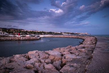 Keywords: cabopino andalusia sea horizon clouds heaven port calm sunset dusk rocks serenity marbella